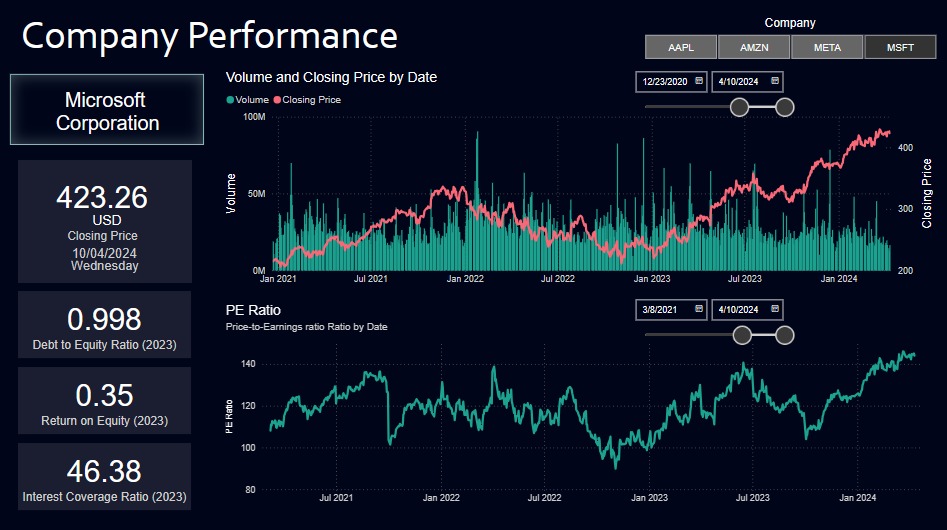 This dashboard offers a concise overview of financial market trends and company performances, highlighting closing prices of indices like the Wilshire 5000, Dow Jones, and NASDAQ over a decade. It includes sector breakdowns for the S&P 500 and NASDAQ, emphasizing Information Technology and Health Care, and details individual metrics for companies like Microsoft and Amazon, such as closing prices, volume, and financials. This visualization combines historical data and current metrics to aid strategic investment decisions.